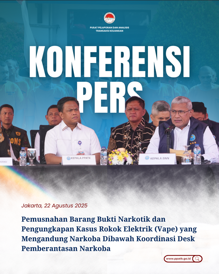 Jakarta, 22 Agustus 2025 — Pusat Pelaporan dan Analisis Transaksi Keuangan (PPATK) menghadiri Konferensi Pers Pemusnahan Barang Bukti Narkoba dan Pengungkapan Kasus Vape Mengandung Narkoba yang digelar di BNN Pusat, Jumat (22/8). Kegiatan ini turut dihadiri oleh Tentara Negara Indonesia(TNI), Direktorat Jenderal Bea dam Cukai Kementerian Keuangan, Polri, Komunitas dan Masyarakat
