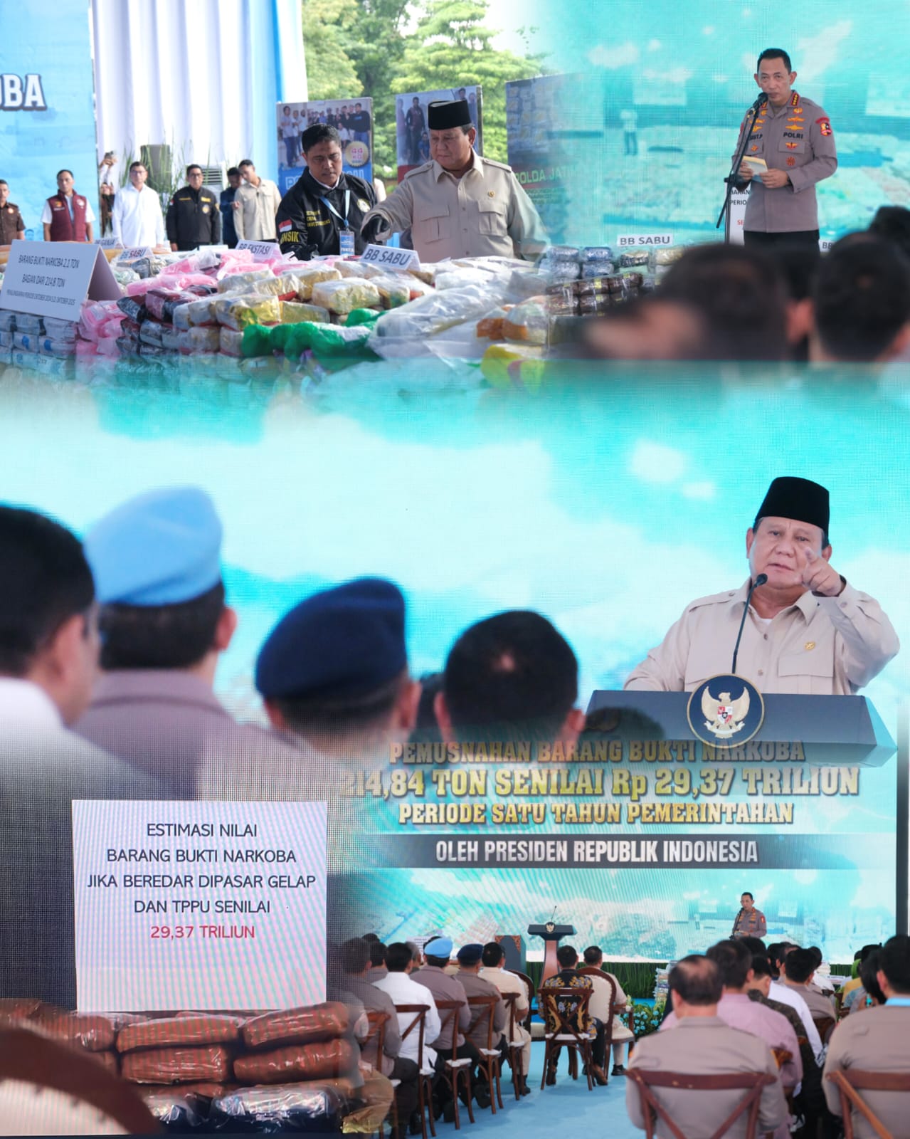 Jakarta—Di bawah sinar matahari terik di Rabu siang Presiden Republik Indonesia, Prabowo Subianto menghadiri acara pemusnahan barang bukti narkotika seberat 214,84 ton dengan estimasi nilai barang bukti senilai Rp29,37 triliun yang diselenggarakan di Lapangan Bhayangkara, Mabes Polri Jakarta, Rabu (29/10). Ini merupakan komitmen penuh pemerintah dalam memerangi kejahatan narkotika.