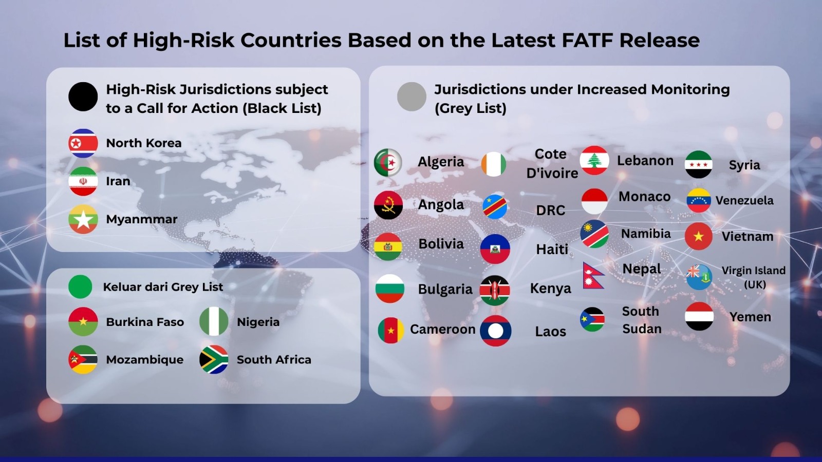 Dalam upaya global memerangi tindak pidana pencucian uang (TPPU), tindak pidana pendanaan terorisme (TPPT), dan pendanaan proliferasi senjata pemusnah massal (PPSPM) , Financial Action Task Force (FATF) telah merilis pembaruan atas daftar negara berisiko tinggi (black list) dan negara dengan peningkatan pengawasan (grey list) pada Oktober 2025. Pembaruan ini berdasarkan hasil sidang pleno FATF yang berlangsung pada 20-24 Oktober 2025 di Paris, Prancis. Negara-negara yang tercantum dalam daftar tersebut dinilai memiliki defisiensi strategis dan fundamental dalam upaya memerangi TPPU, TPPT, dan pendanaan proliferasi senjata pemusnah massal.