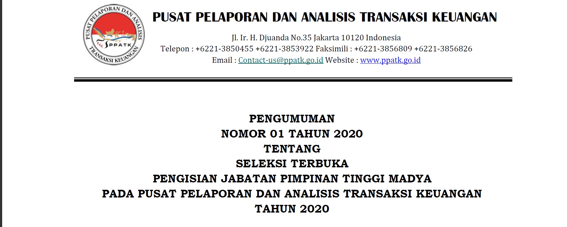 Dalam rangka pengisian Jabatan Pimpinan Tinggi Madya di lingkungan Pusat Pelaporan dan Analisis Transaksi Keuangan Tahun 2020 sesuai dengan Undang-Undang Nomor 5 Tahun 2014 tentang Aparatur Sipil Negara dan Peraturan Pemerintah Nomor 11 Tahun 2017 tentang Menajemen Pegawai Negeri Sipil, dengan ini kami mengundang Pegawai Negeri Sipil (PNS), Anggota Kepolisian Negara Republik Indonesia (POLRI), dan Non PNS yang berminat dan memenuhi persyaratan untuk untuk mengikuti seleksi terbuka Jabatan Pimpinan Tinggi Madya untuk Jabatan Deputi Bidang Pemberantasan. Untuk Informasi selengkapnya dapat mengunduh Pengumuman