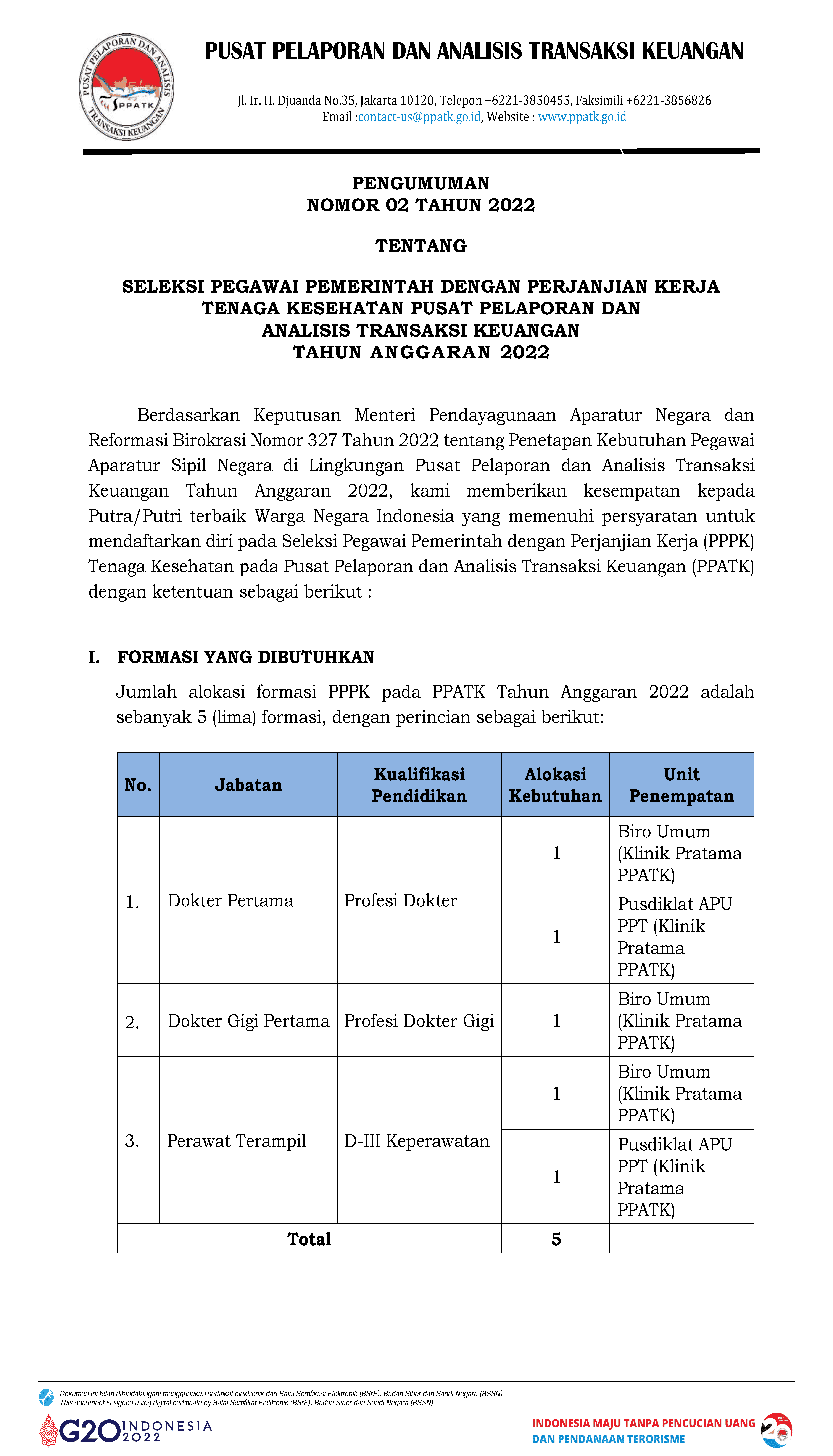 Pengumuman 02 Tahun 2022 Pengadaan PPPK Tenaga Kesehatan PPATK TA 2022