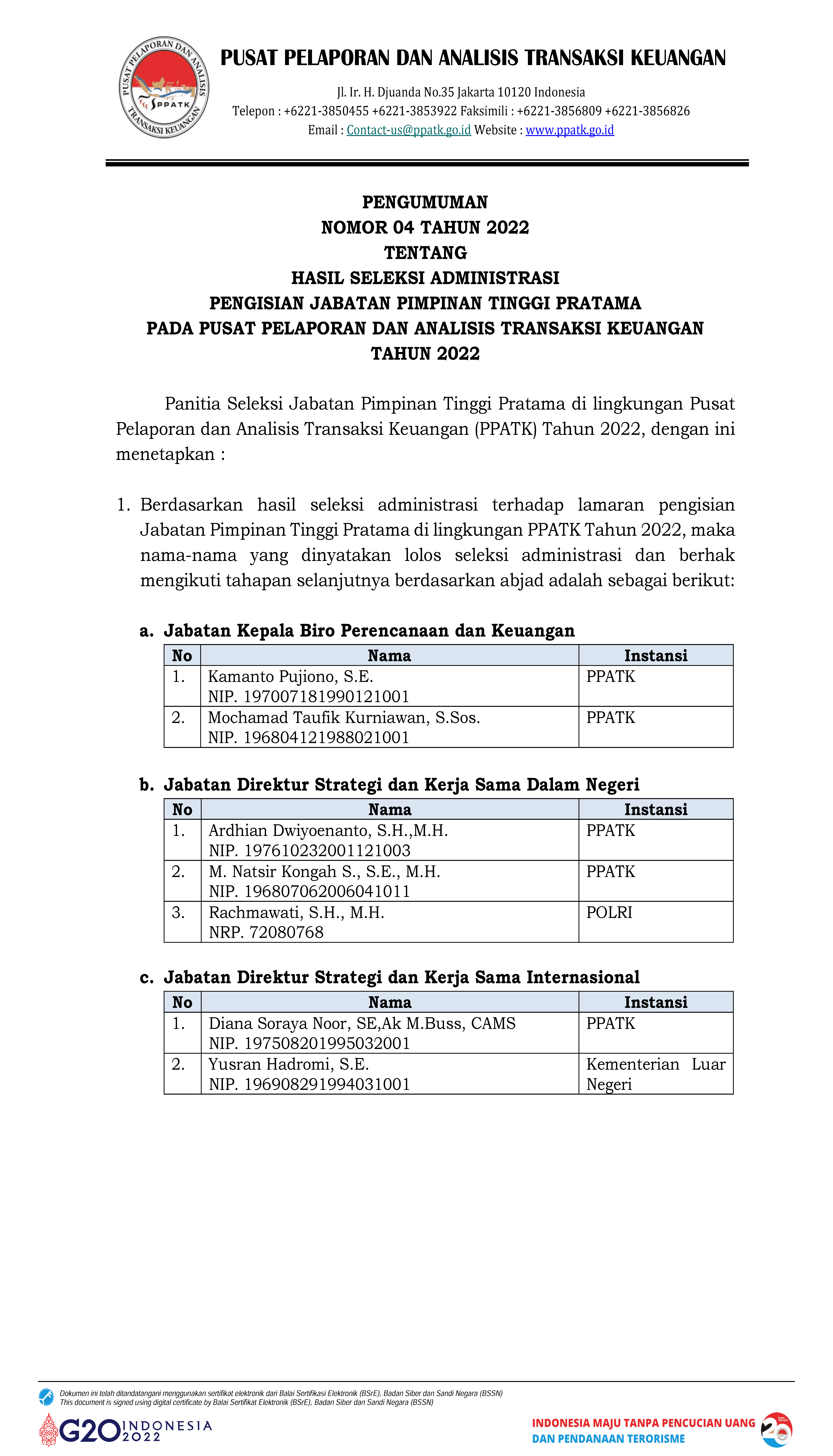 Pengumuman 04 Tahun 2022 Hasil Seleksi Administrasi JPT Pratama Pada PPATK