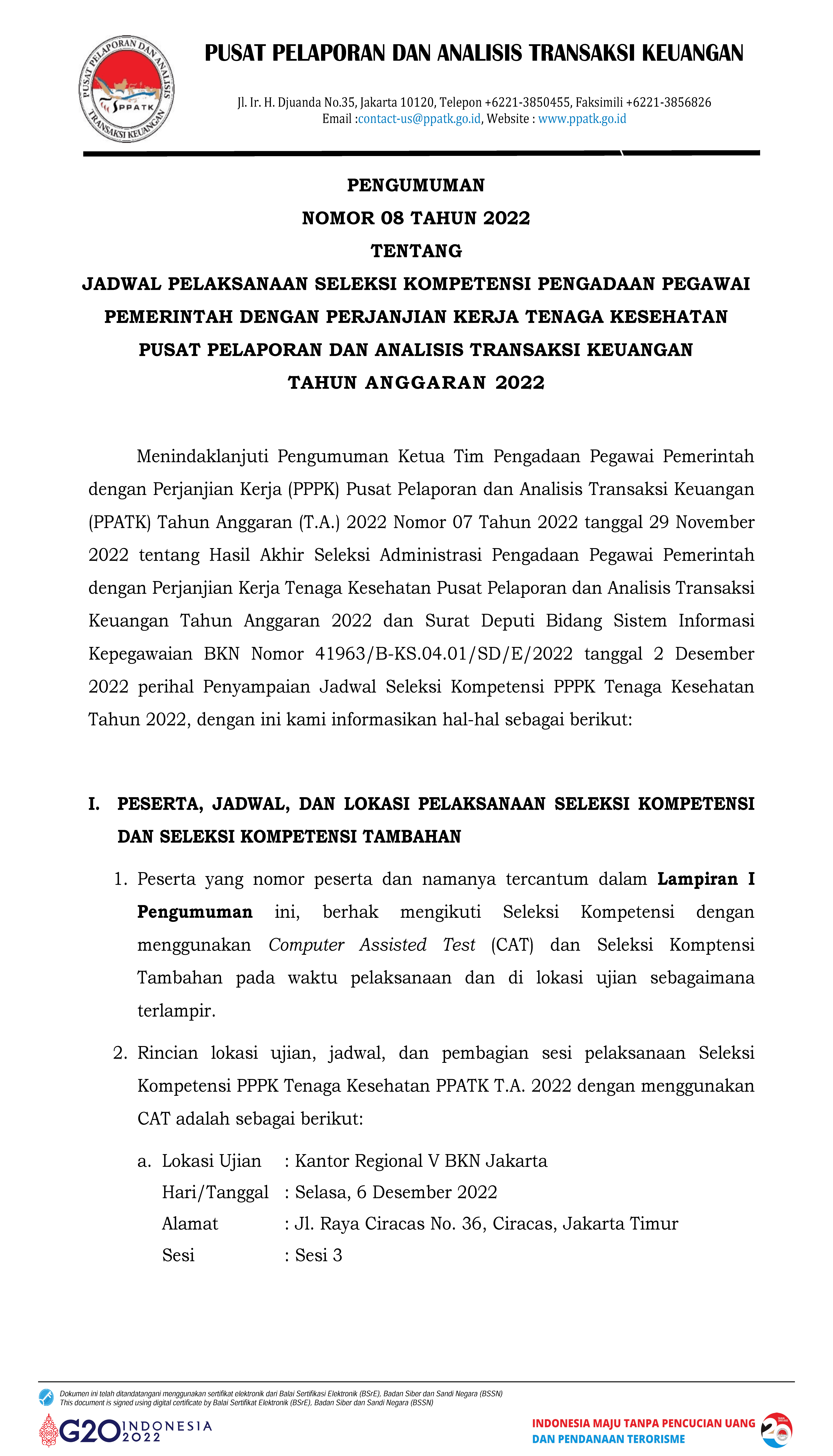 Pengumuman 08 Tahun 2022 Pengumuman Jadwal Pelaksanaan Seleksi Kompetensi PPPK Tenaga Kesehatan PPATK TA 2022-1