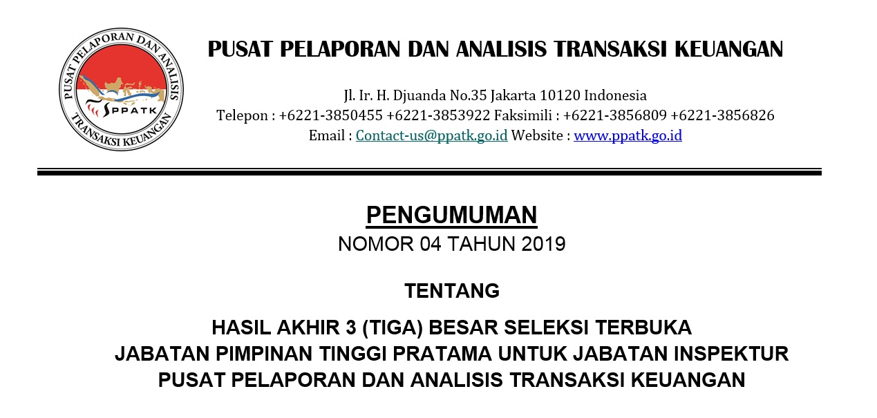 Pengumuman Hasil Akhir 3 (tiga) Besar Seleksi Terbuka JPT Pratama untuk Jabatan Inspektur PPATK