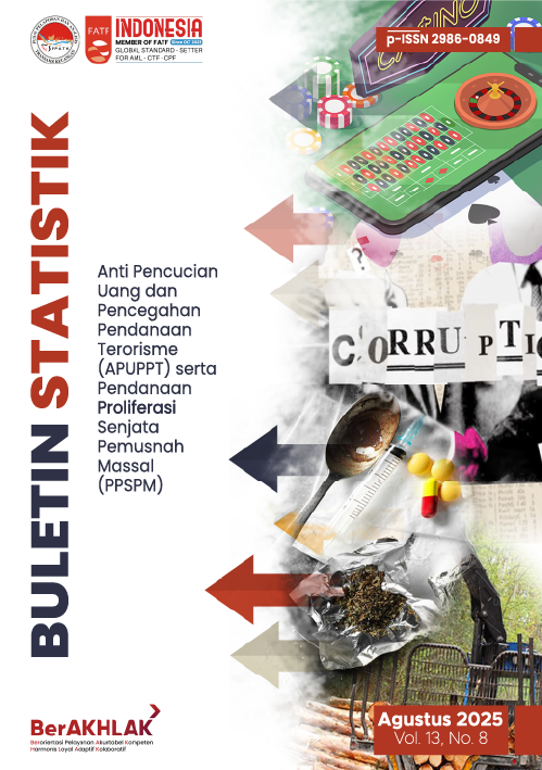 uletin Statistik APUPPT disusun secara periodik untuk menyampaikan hasil pelaksanaan tugas dan fungsi PPATK dalam upaya mencegah dan memberantas Tindak Pidana Pencucian Uang di Indonesia sebagaimana tercantum dalam Undang – Undang Nomor 8 tahun 2010 tentang Pencegahan dan Pemberantasan Tindak Pidana Pencucian Uang (selanjutnya disebut UU PP TPPU) serta Undang – Undang Nomor 9 tahun 2013 tentang Pencegahan dan Pemberantasan Tindak Pidana Pendanaan Terorisme (selanjutnya disebut UU PP TPPT). Dalam buletin ini, statistik yang dihimpun mencakup: 1. Perkembangan aktivitas pelaporan oleh Pihak Pelapor (Penyedia Jasa Keuangan/PJK, Penyedia Barang dan/atau Jasa Lain/PBJ, dan Profesi) serta Ditjen Bea Cukai; 2. Penyampaian Hasil Analisis dan Hasil Pemeriksaan kepada Aparat Penegak Hukum serta 3. Informasi lainnya yang terkait dengan pelaksanaan tugas PPATK. Hingga bulan Agustus 2025, PPATK telah menyampaikan Hasil Analisis (selanjutnya disebut HA) kepada Penyidik sebanyak 88 HA dengan 36 HA Proaktif dan 52 HA Inquiry sementara untuk dugaan tindak pidana yang paling dominan adalah Tindak Pidana Korupsi (30 HA/34,1%) serta 1 Hasil Pemeriksaan (selanjutnya disebut HP). Sementara itu, selama bulan Agustus 2025 pula, jumlah laporan yang diterima PPATK sebanyak 3.494.344 dan mengalami penurunan dibandingkan dengan bulan sebelumnya sebesar -11,8%. Penurunan tertinggi (dibandingkan dengan bulan Juli 2025) terjadi pada penerimaan LTKM yaitu sebesar -30,4% dan LTKT sebesar -19,5%.